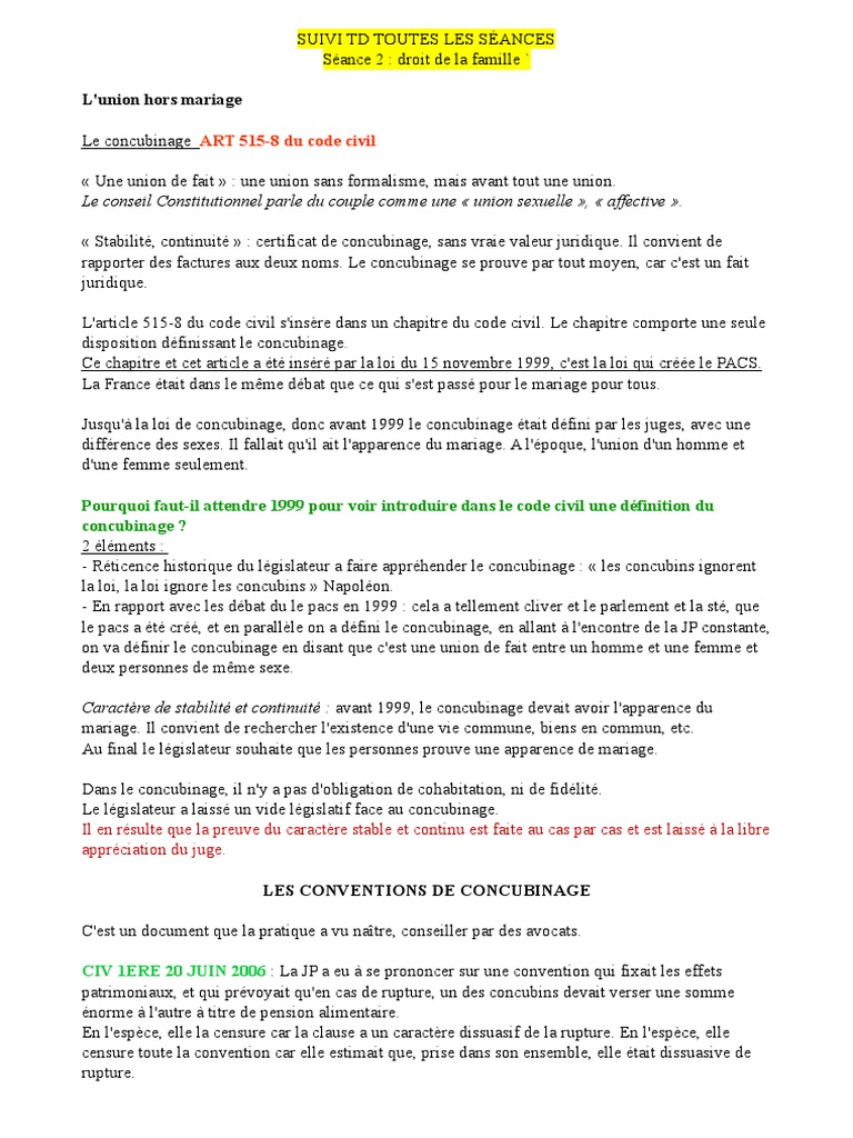 Td Droit De La Famille Concubinage Mariage