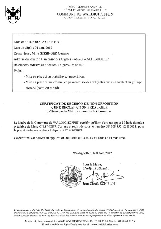 Certificat De Non Opposition Pour La Dp 12e0031 Waldighoffen
