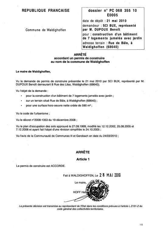 Arrete De Permis De Construire N Pc10e0005 Sci Bux Waldighoffen