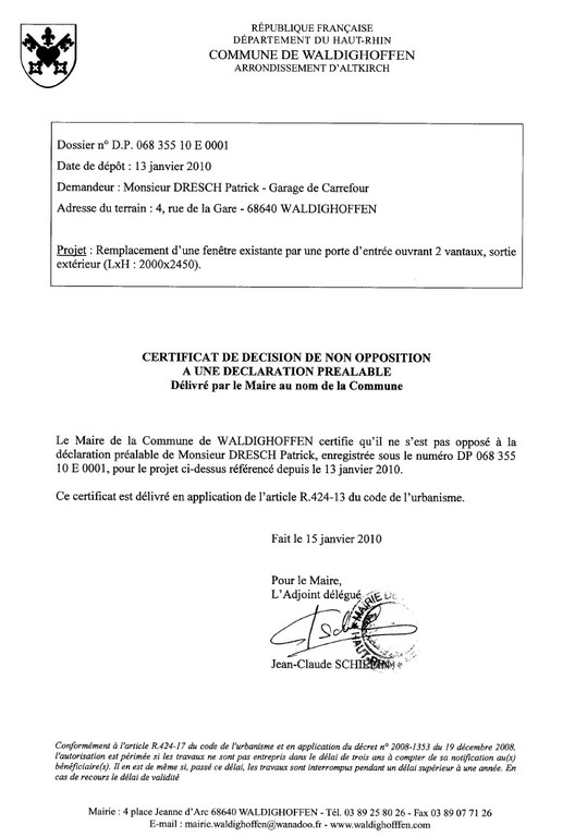 Certificat De Non Opposition Pour La Dp 12e0031 Waldighoffen