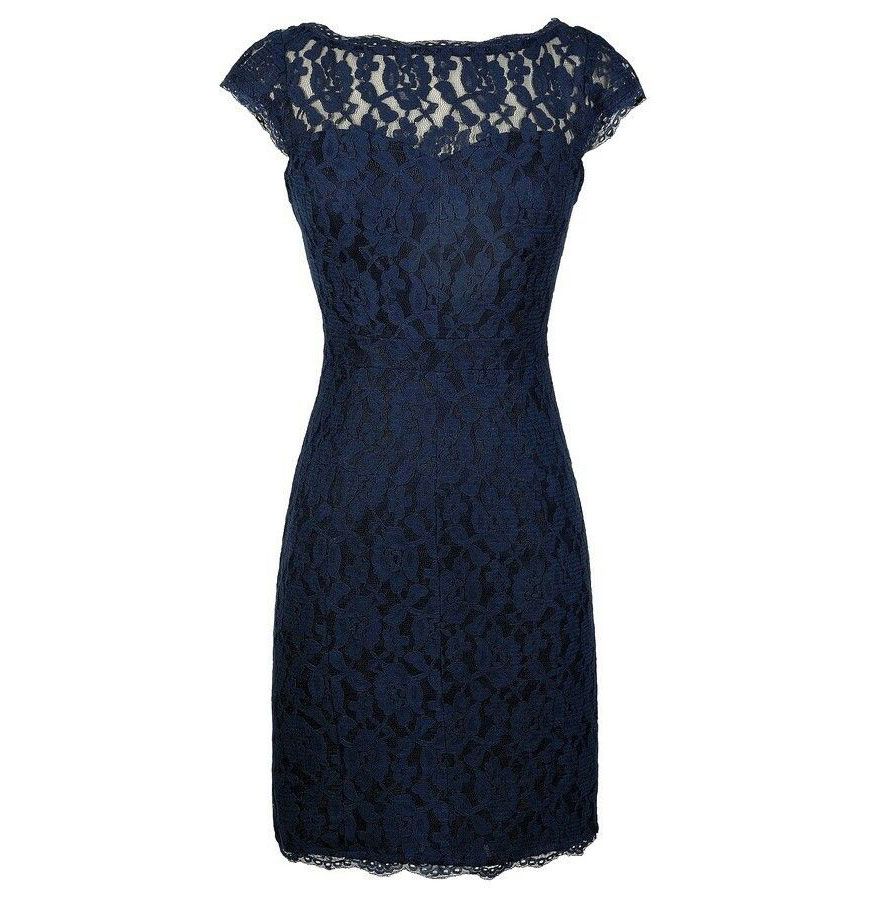 Robe Bleu Marine Col Illusion En Dentelle Au Genou Pour Cocktail